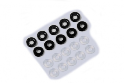 This is a packet of (10) Chassis Tweak Adjustment Washers and O-rings designed to enhance consistent grip and reduce chassis tweak that can develop during crashes.