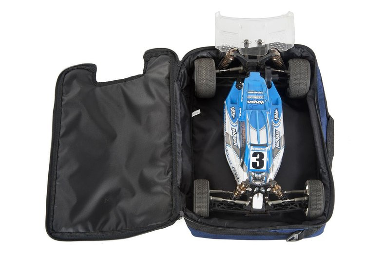 Designed for racers looking for a convenient solution to transport an electric 1/10 buggy, the bag is a great way to keep your buggy from rolling around in your car or back of your truck, containing all the dirt and grime after a long day at the track. It also fits great on top of your hauler bag when loading or unloading at the track.