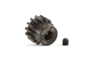 This is a 12 tooth Mod1 pitch pinion from AVID Racing Concepts which is made out of hardened steel to reduce wear.
