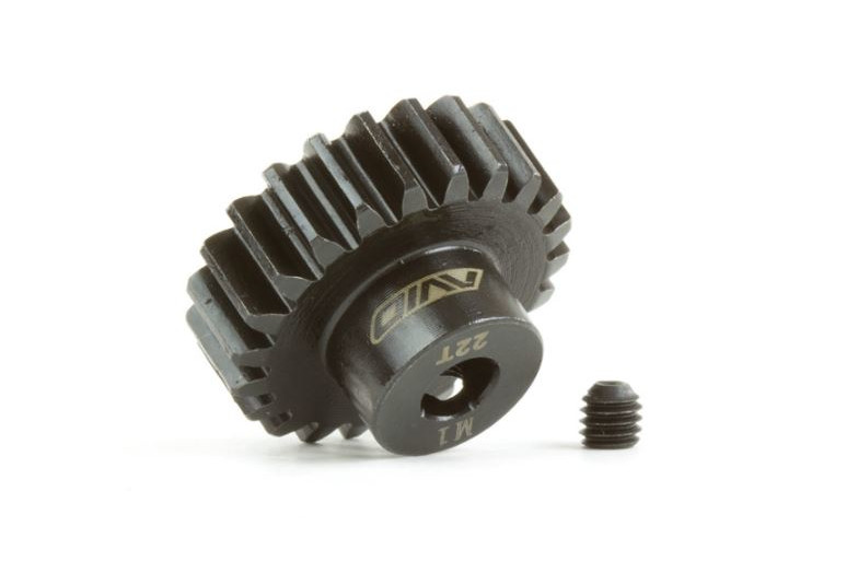 This is a 22 tooth Mod1 pitch pinion from AVID Racing Concepts which is made out of hardened steel to reduce wear.