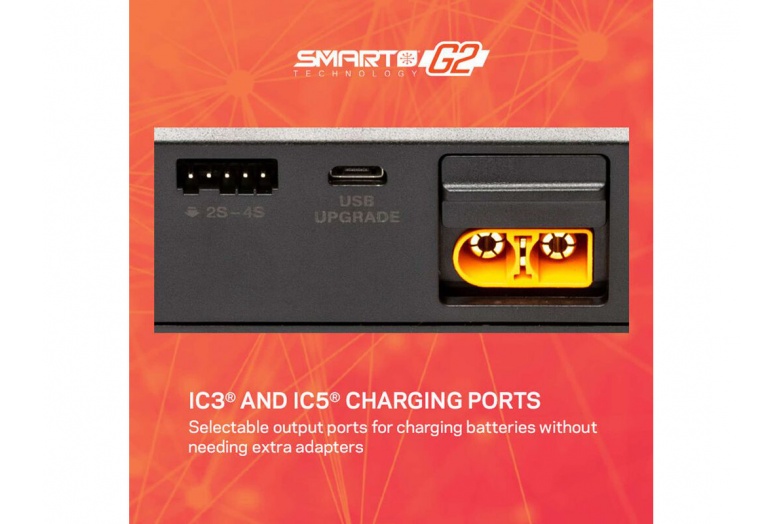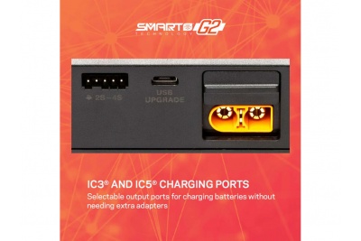 The S155 Smart G2 AC Charger includes selectable IC3® or IC5® output ports for charging your Smart batteries without needing adapters. You can charge and balance Smart G2 batteries with one simple connection — no separate balance lead is required. A USB input port is also provided for easily keeping the charger's firmware up to date.