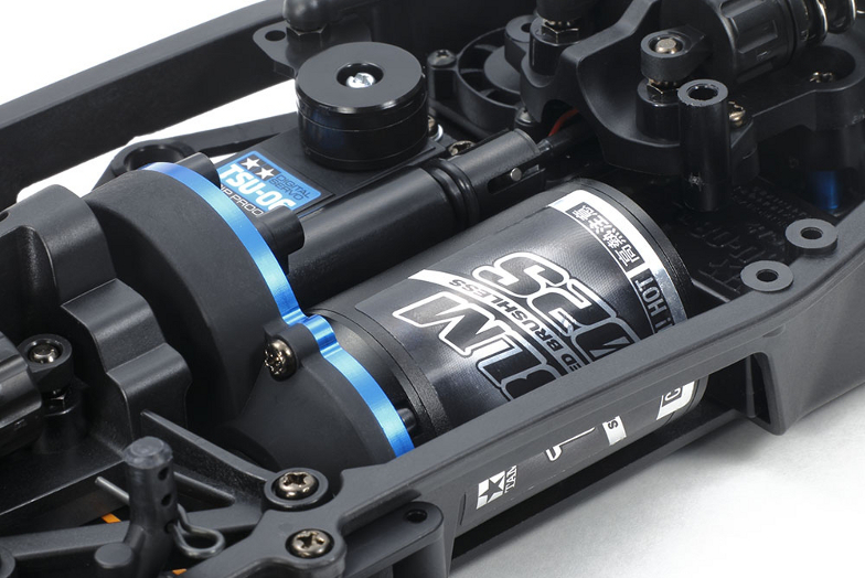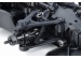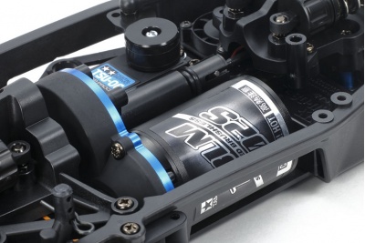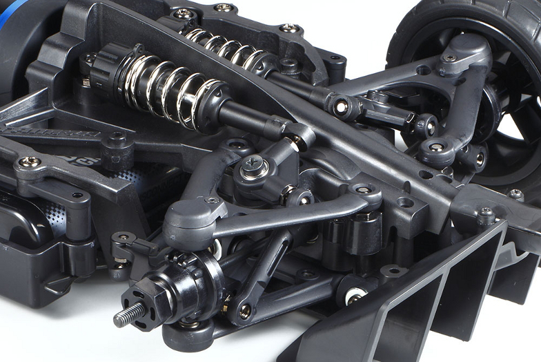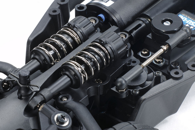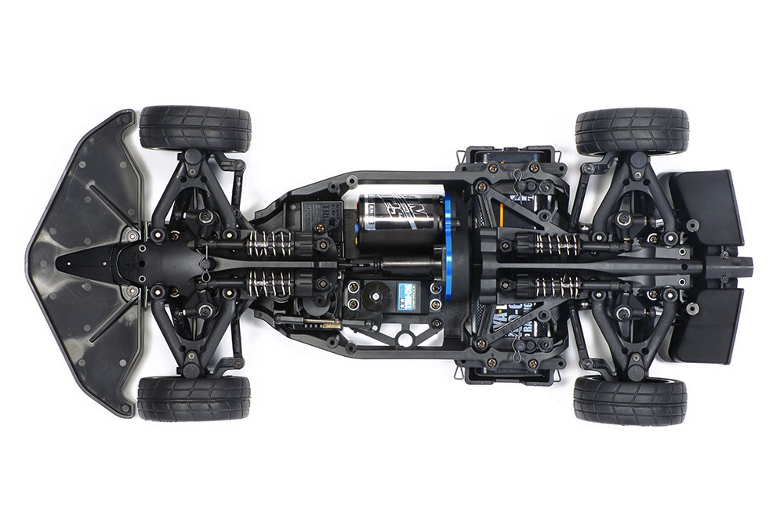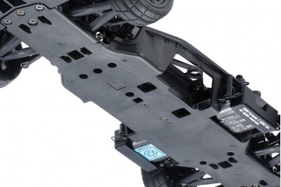 This durable composite monocoque-frame chassis provides shaft driven 4WD from a central motor via front and rear propeller shafts, with oil filled gear differentials. 4-wheel independent double wishbone suspension employs long arms, plus inboard setups front and rear with oil shock-dampers actuated by push rods and rocker arms to allow the use of low-profile bodies.