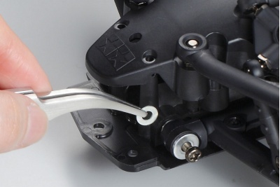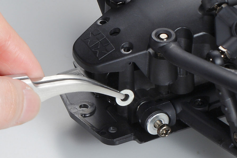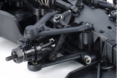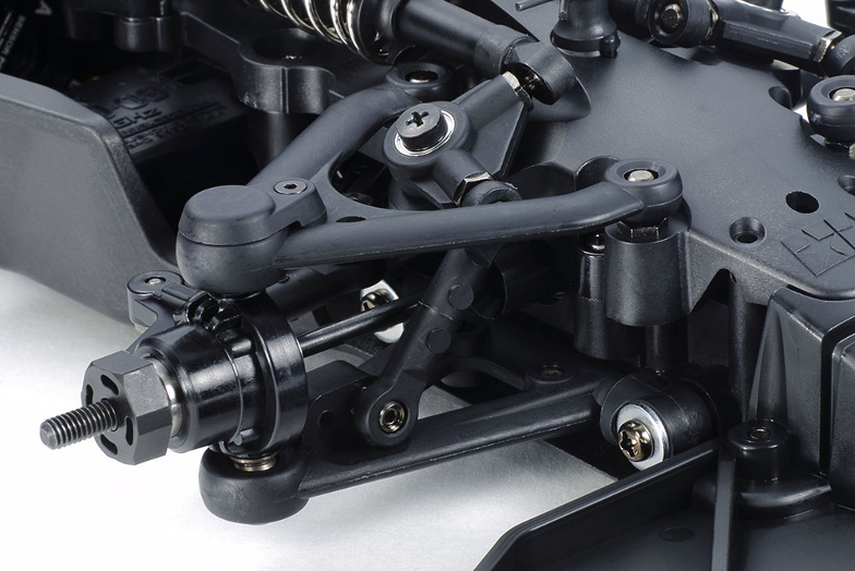 Adjust spacer width to easily alter camber, skid and toe angle settings. Both suspension arms and uprights are identical left, right, front and rear, for more efficient maintenance and pit work.
