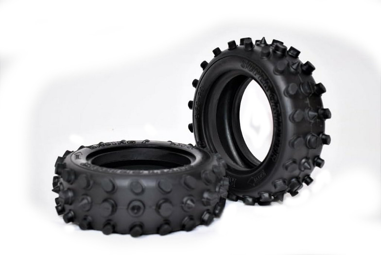 This is a packet of (2) front Oval Block tires from Tamiya for a lot of their 1/10 vehicle, such as the Hotshot, Boomerang, Bigwig, Super Sabre, etc, but will fit other 1/10 vehicle.