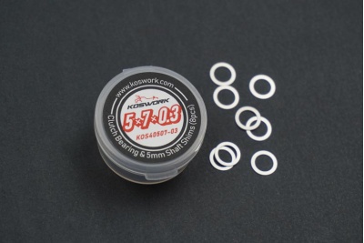 This is a packet of 5 x 0.3mm stainless steel clutch bearing shims from Koswork designed to fit 5mm crankshafts which are used for all .12, .21, and .28 engines.
