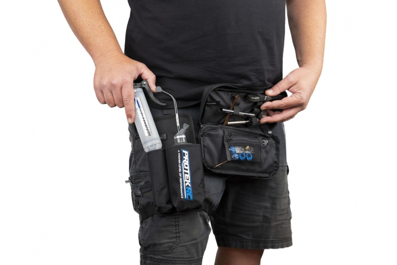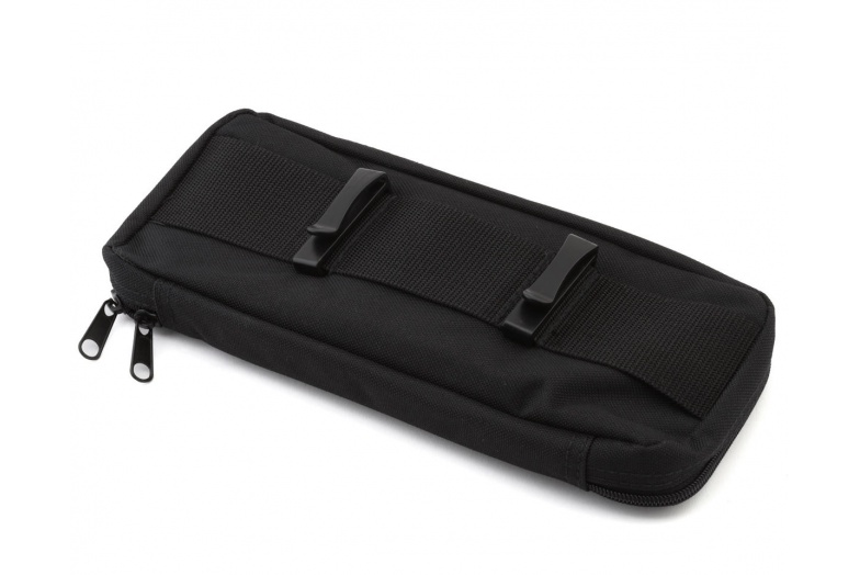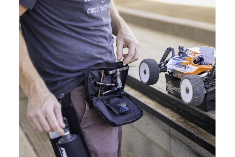 Constructed from heavy-duty fabric, this pack is built to withstand the rigors of the racing environment. Its compact design makes it easy to carry, while a zippered compartment and elastic straps securely hold your tools, ensuring nothing is left behind. The zippered pouch is perfect for storing small parts like glow plugs, and the additional elastic straps behind the zippered pouch are ideal for items like tuning screwdrivers or glow igniters. With belt clips included, this is a must have for any racer!